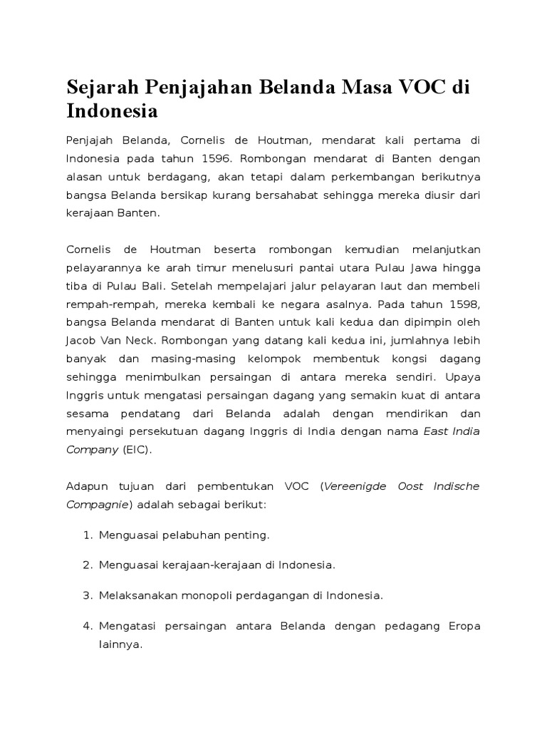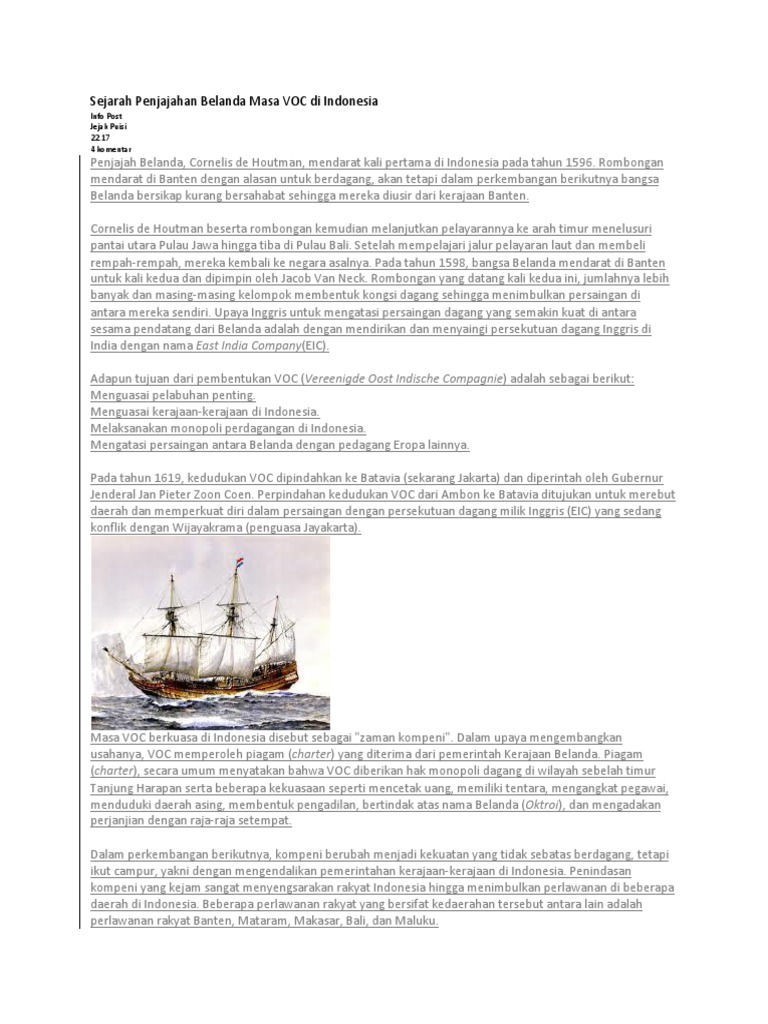 Doc Sejarah Penjajahan Belanda Masa Voc Di Indonesia Lyner Barset Academia Edu from 0.academia-photos.com Tujuan pembentukan voc sebenarnya tidak hanya untuk menghindari persaingan di antara pedagang belanda, tetapi juga menyaingi kongsi dagang semoga kedepannya grup ini dapat memyebarkan ilmu dan pengetahuan yang lebih lengkap dan sesuai dengan kenyataan sejarah yang terjadi. Pada 1598, parlemen belanda (staten generaal) mengusulkan perusahaan yang saling bersaing itu digabung menjadi sebuah kongsi dagang. Belanda tertinggal satu abad dalam menjelajah asia. Tujuan pembentukan voc tidak lain adalah menghindarkan persaingan antar pengusaha belanda (intern) serta mampu menghadapi persaingan dengan bangsa jenderal voc antara lain: Berikut 10 fakta sejarah di balik voc yang jarang orang ketahui. Ada beberapa teori pembentukan bumi yang dikemukakan ahli sebagai berikut nah, seperti itu sejarah pembentukan bumi dan perkembangannya. Dampak kegiatan monopoli perdagangan yang dilakukan voc di indonesia (nusantara saat itu) memang lebih condong ke sisi negatif (bisa dibilang kebanyakan dampak buruknya), namun disisi lain ada juga dampak positif yang dapat dipetik. Sejarah berdirinya voc (vereenigde oostindische compagnie).